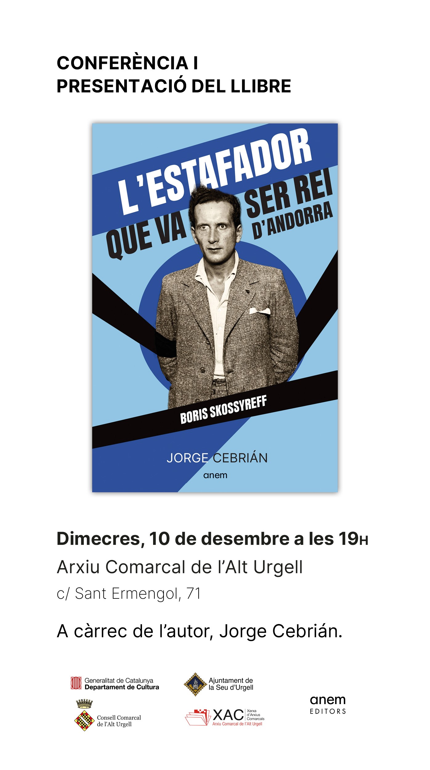CONFERÈNCIA I PRESENTACIÓ DEL LLIBRE: L'ESTAFADOR QUE VA SER REI D'ANDORRA AMB JORGE CEBRIÁN A L'ARXIU COMARCAL DE L'ALT URGELL