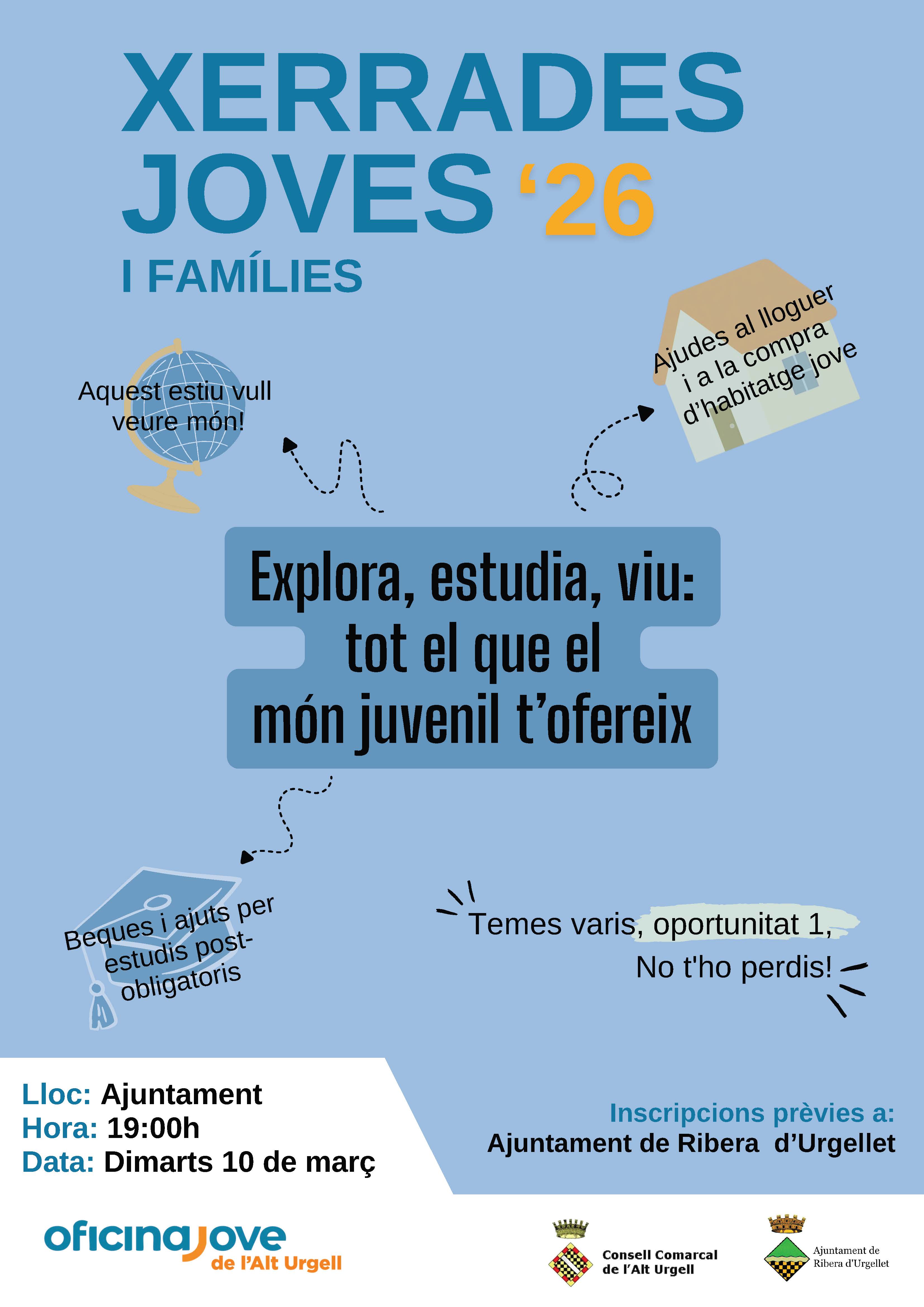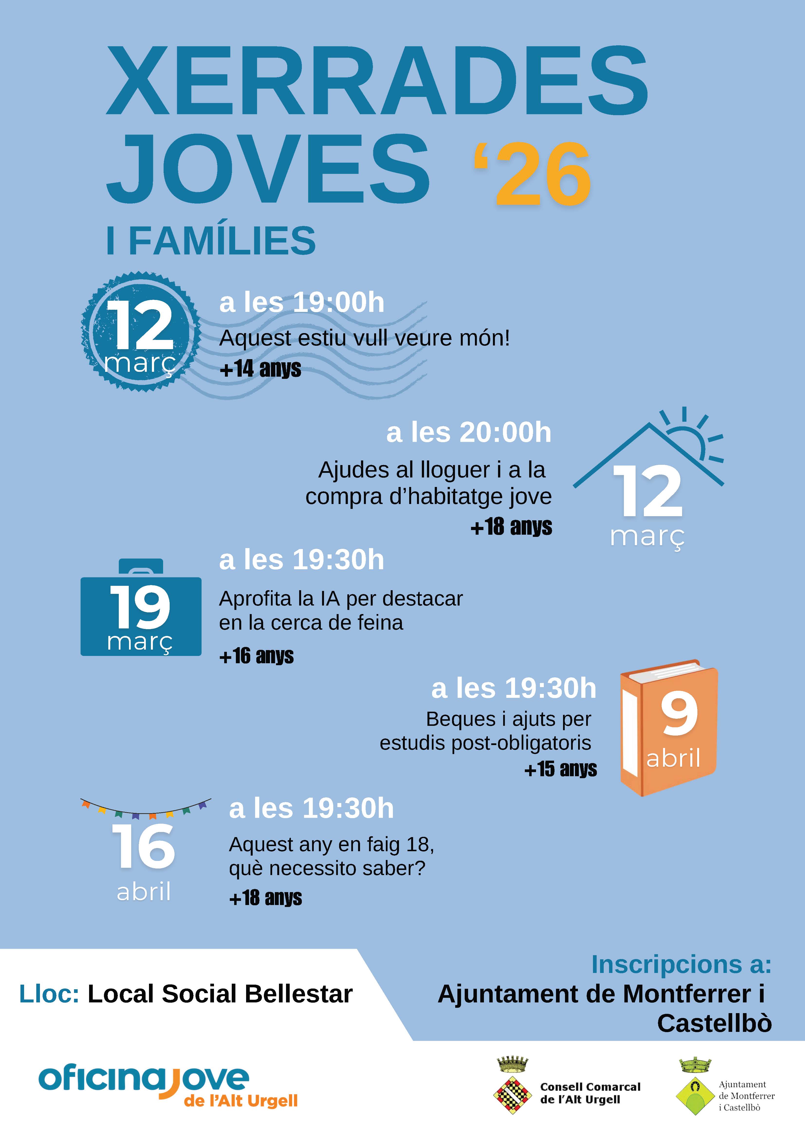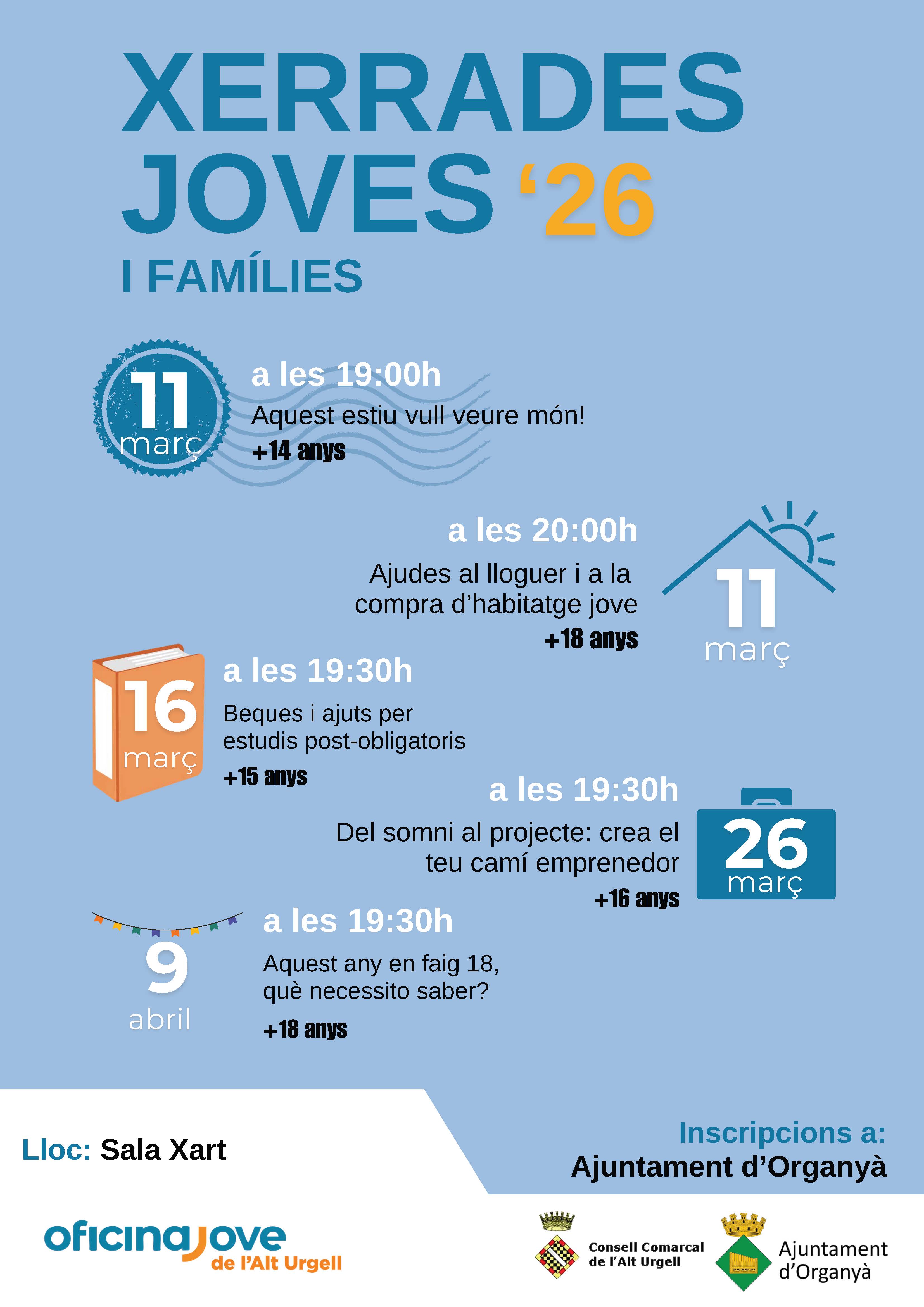 El Cicle de Xerrades Joves compta amb la col·laboració dels ajuntaments de Montferrer i Castellbó, Organyà, Ribera d’Urgellet i Oliana i per participar-hi cal inscriure-s’hi a través dels canals que determina cada ajuntament. Totes les activitats són gratuïtes i obertes a tothom.