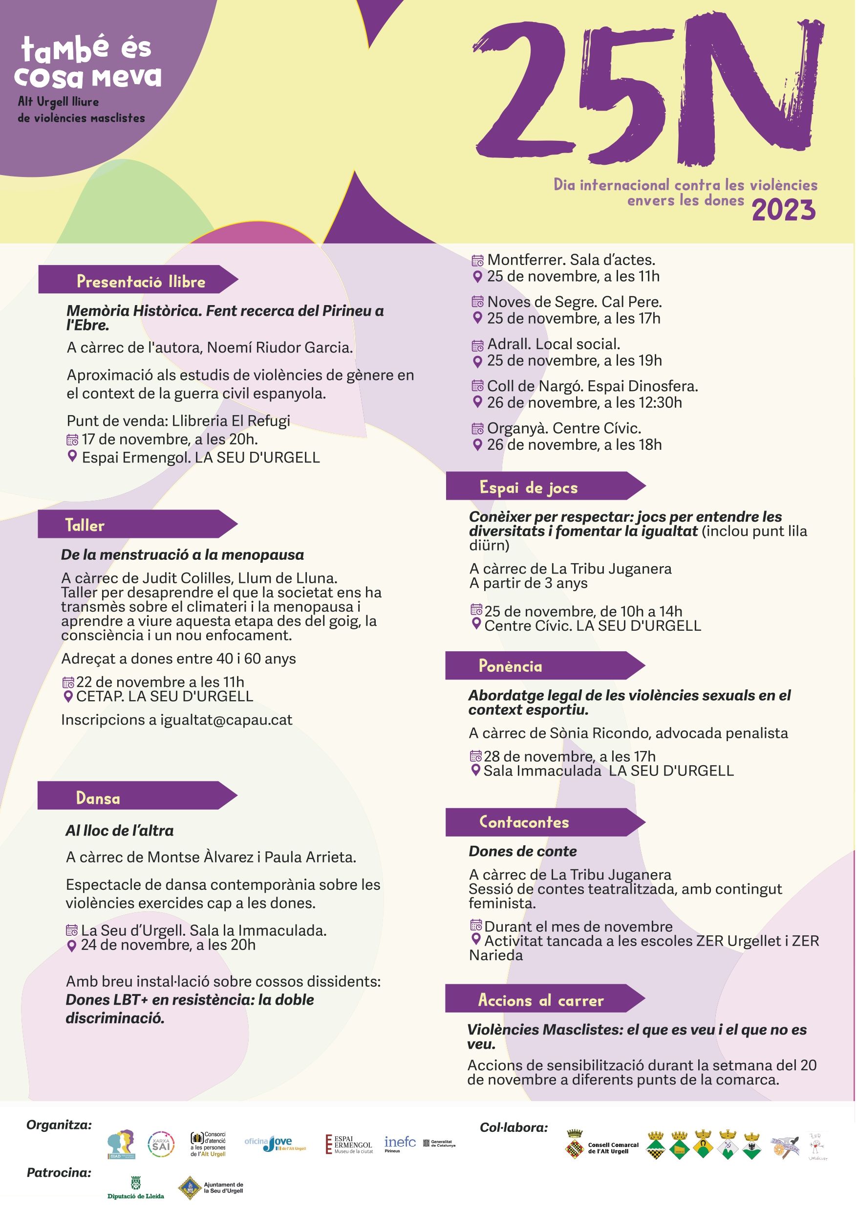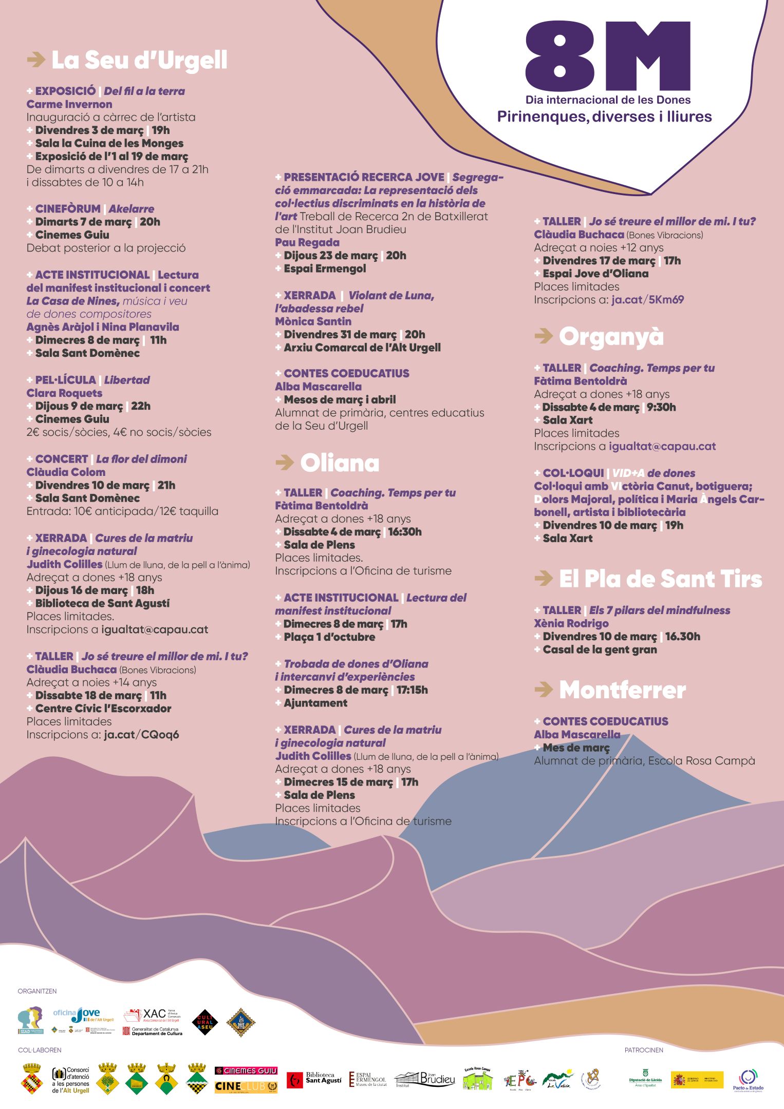 - Commemoració del Dia de la dones (8 de març) i del Dia contra la Violències envers les dones (25 de novembre)