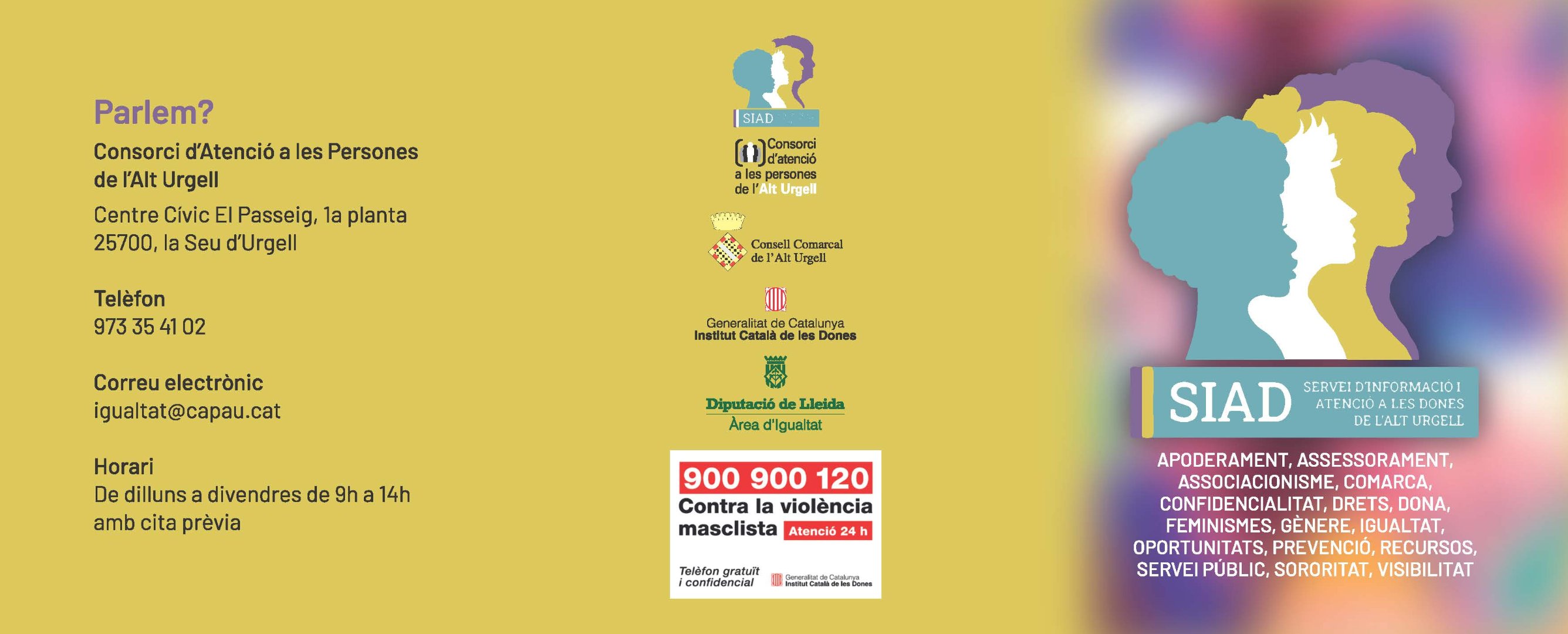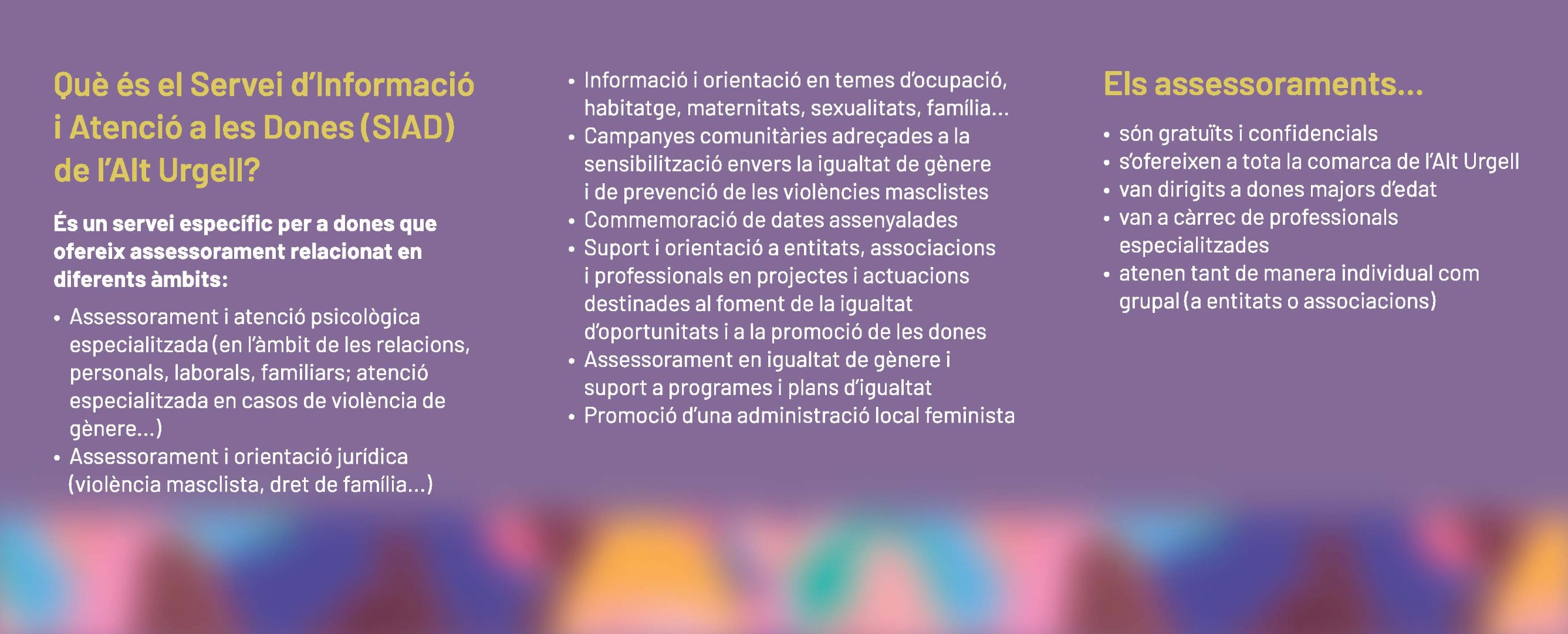 El SIAD de l’Alt Urgell és un servei integral destinat a donar informació, assessorament i orientació a totes les dones de la comarca, en tots aquells temes d’interès per a elles. Facilita el seu accés a diferents recursos del territori de tipus laboral, associatiu, cultural i educatiu, entre d’altres.