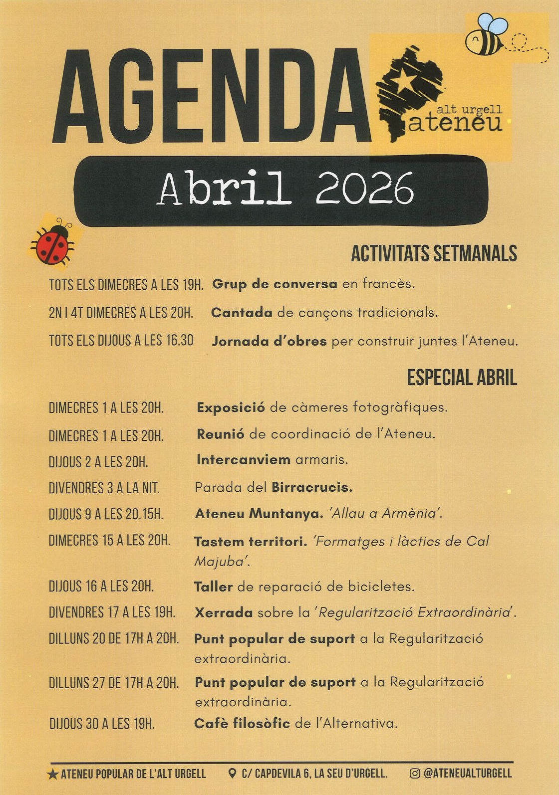 AGENDA DE L'ATENEU: ABRIL 2026 - ATENEU MUNTANYA "ALLAU A ARMÈNIA"