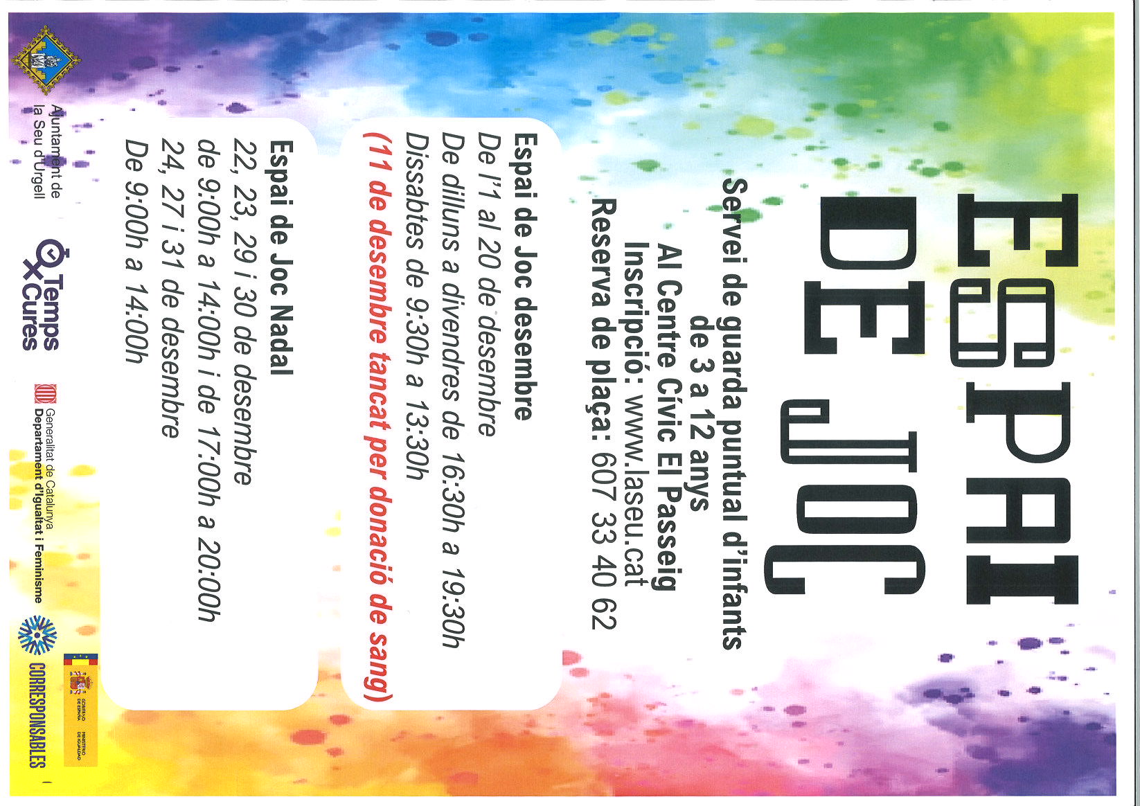 ESPAI DE JOC: SERVEI DE GUARDA PUNTUAL D'INFANTS DE 3 A 12 ANYS, AL CENTRE CÍVIC EL PASSEIG DE LA SEU